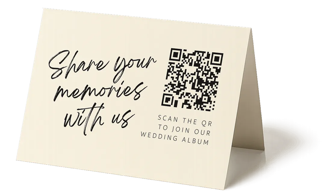 Guests scan the QR code to upload unlimited photos & videos. You can also share a link digitally.