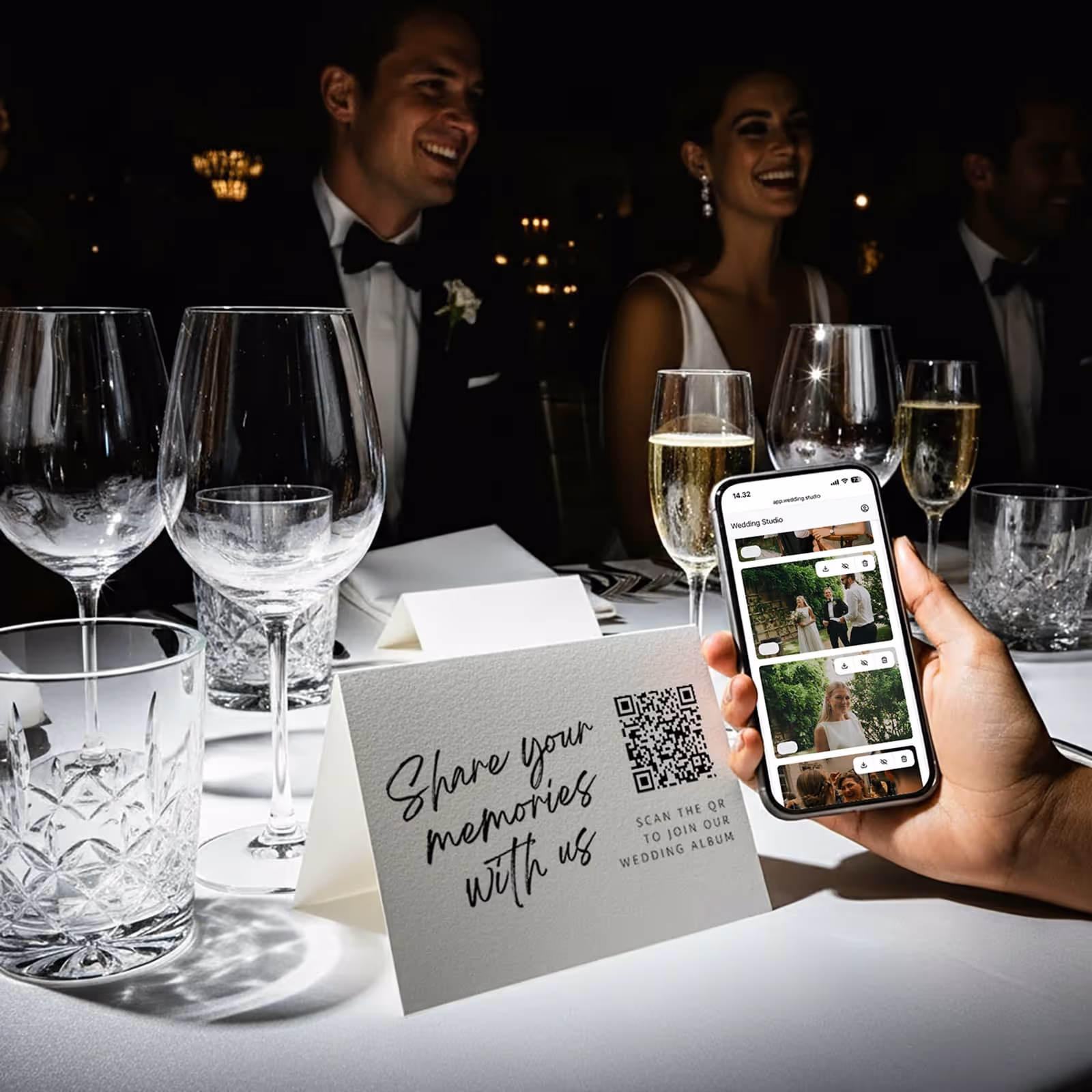 Guests scan the QR code to upload unlimited photos & videos. You can also share a link digitally.